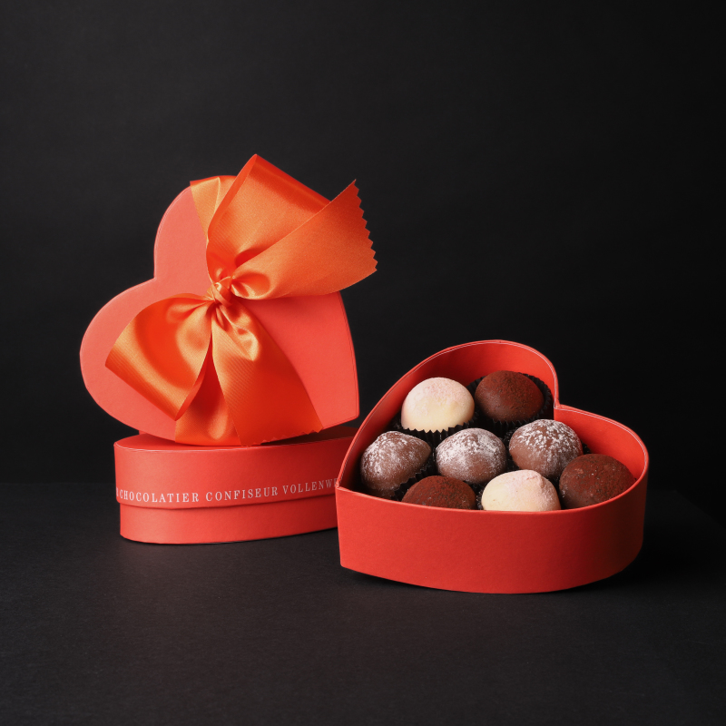 Herzboîte gefüllt mit 8 Truffes Champagne Fine (weisse, helle und dunkle Schokolade) mit Nonpareils-Schokoladenherz (165g)